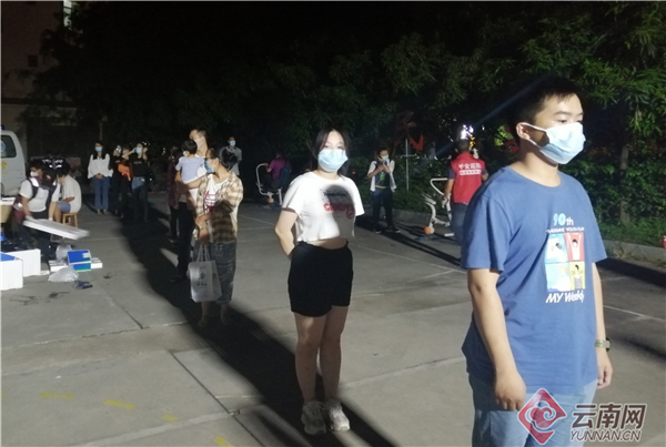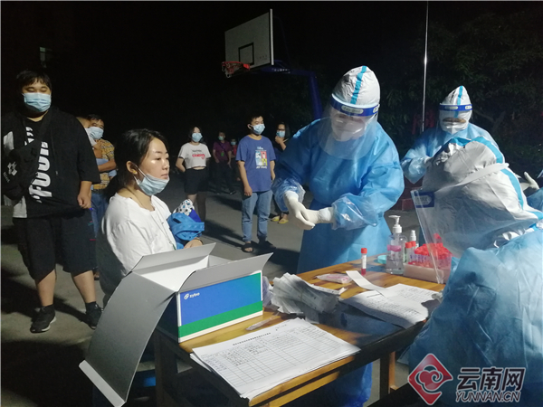 与此同时,在瑞丽市勐卯社区核酸检测点,也呈现出一片灯火通明的景象。检测工作人员身穿防护服,正在对市民核酸检测进行核酸检测。