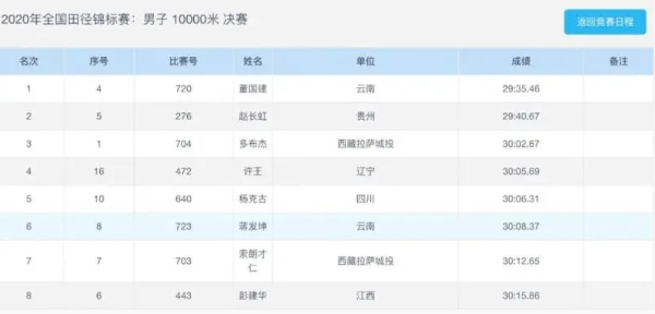 9月15日—9月18日,2020全国田径锦标赛在浙江绍兴上虞体育场举行。在9月16日上午结束的男子10000米决赛中,云南名将董国建以29分35秒46的成绩,力压主要竞争对手多布杰、彭建华夺得冠军。