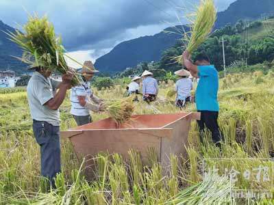 当前正值早稻成熟季节。走进镇康县凤尾镇傣族寨,村民正抢抓农时,科学有序加快早稻收割,确保颗粒归仓。
