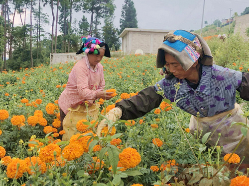 金秋时节,个旧市保和乡斐贾村委会的千亩万寿菊竞相开放,村民们都忙着采摘成熟的万寿菊售卖。该村今年引导村民种植万寿菊,不仅给种植户带来了实实在在的收益,也促进了村级集体经济发展。