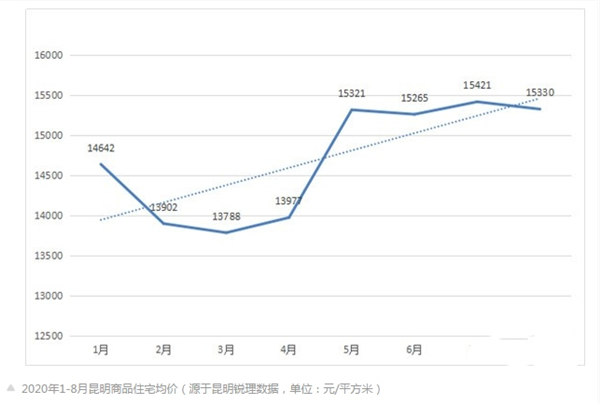 昆明锐理数据发布显示,今年1月,昆明商品住宅均价为14642元/平方米;2月、3月出现连续下跌,跌破14000元关口;5月份开始大幅上涨,并首次突破了15000元关口,达到了15321元/平方米。而且从5月份至今,昆明商品住宅价格已经连续4个月均价保持在15000元/平方米以上。