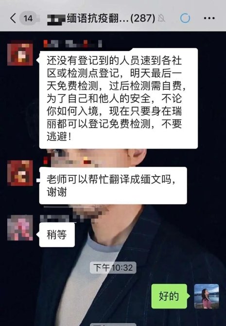 瑞丽市抗疫工作者:在与缅籍人员交流中,有任何语言沟通障碍,可加入“素素缅语抗疫翻译公益群”,我们将提供免费翻译服务。