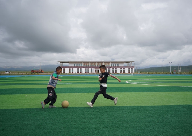 临近海南藏族自治州兴海县城,一派秀美气象让记者途中疲劳尽消:一个坐落在碧绿草原中的村落映入眼帘,一排排色彩鲜亮的藏家民居错落有致,村中央建有一块标准足球场,正在踢球的孩子们追逐嬉戏……