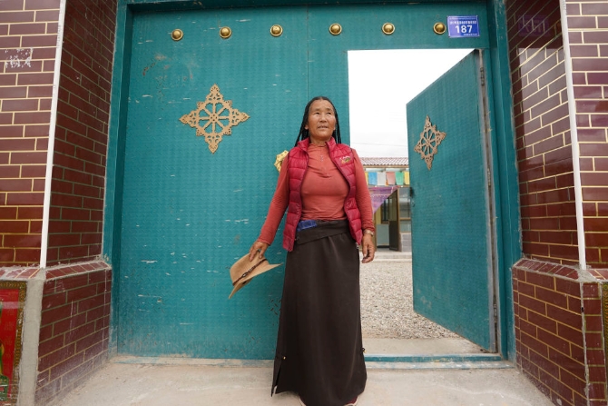这是住在青海省海南藏族自治州兴海县安多民俗文化村的65岁的藏族阿妈周德(8月6日摄)。新华社记者 邢广利 摄