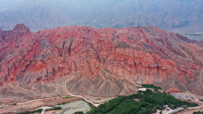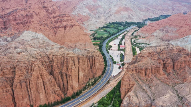 这是6月16日拍摄的位于青海省海南藏族自治州贵德县境内的丹霞地貌(无人机照片)。新华社记者 吴刚 摄