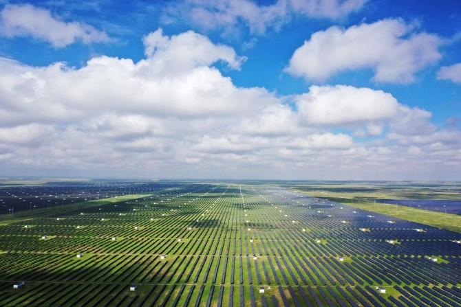 登上47米高的瞭望塔,曾经的荒漠戈壁变了模样,高天流云的影子在绵延天际的太阳能电池板上移动。