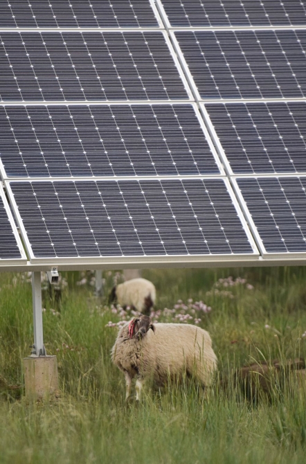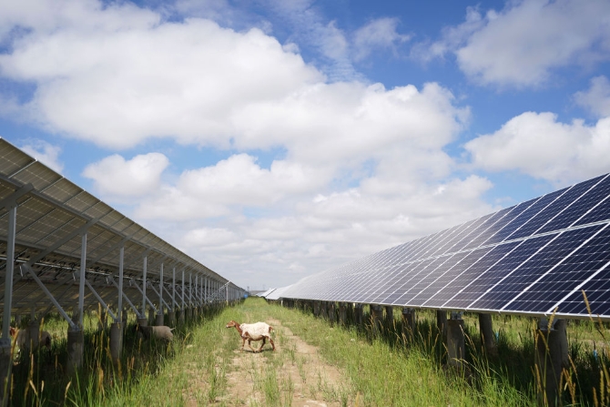 羊群在青海省海南藏族自治州光伏发电园区内吃草(2019年6月16日摄)。新华社记者 吴刚 摄