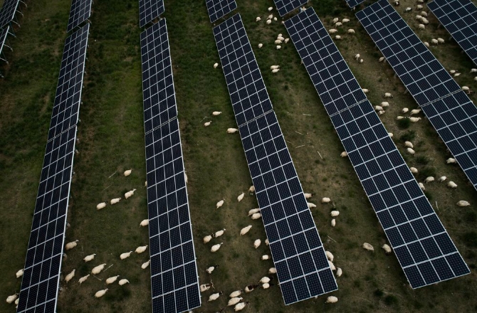 羊群在青海省海南藏族自治州光伏发电园区内吃草(2019年6月16日摄,无人机照片)。新华社记者 吴刚 摄