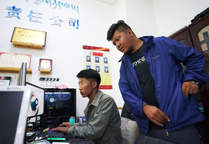 青海阿妈罗罗文化传播有限责任公司的藏族小伙儿斗本加(右)和同事在给一部文化旅游宣传片进行后期制作(8月5日摄)。新华社记者 邢广利 摄