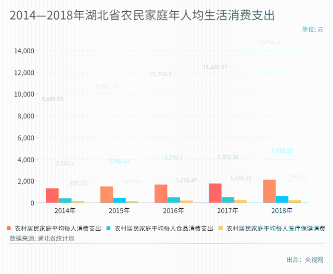 2019年湖北农村贫困人口为5.8万人,比上年减少92.5万,脱贫任务成果斐然。农村人均可支配收入逐年增长,2018年为人均14977元。农村家庭年人均消费支出也增至13946元,比上年增长8.3%。