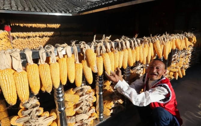 司莫拉佤族村民晾晒玉米。杨峥/摄