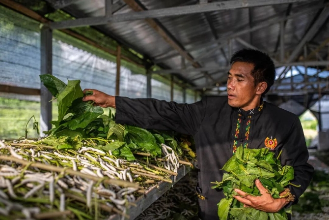 在云南省陇川县陇把镇曼崩村,董跑约在蚕棚里给“蚕宝宝”喂桑叶。胡超/摄