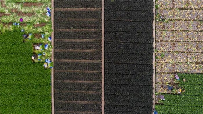 云南省玉溪市通海县秀山街道农民在田间劳作(无人机照片)。胡超/摄
