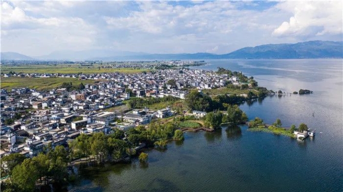 云南省大理市古生村村貌与洱海风光(无人机照片)。胡超/摄