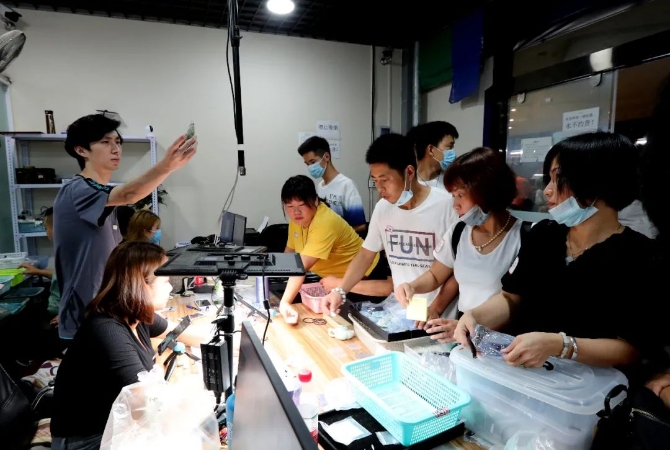 姐告玉城直播基地逐渐人声鼎沸,数百个摊位同时“开工”(资料图)。李秋明/摄