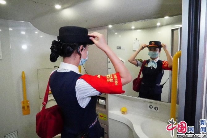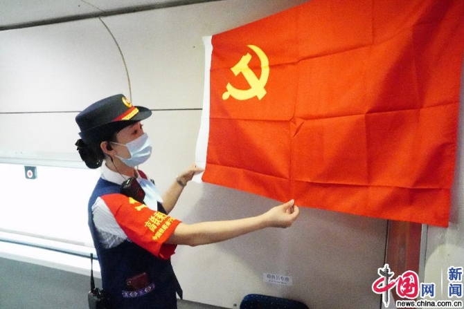 G421次列车临时乘务党支部会议前孙雪整理党旗。中国网记者 刘维佳/摄