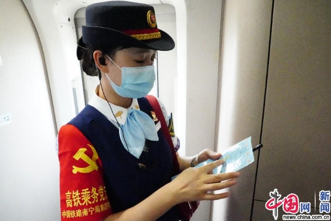 中国网9月21日讯(记者 刘维佳)9月21日,在G421次“刘三姐”号动车组列车4号车门口,列车长孙雪正在迎接旅客上车,她甜美的微笑与胸前闪亮的党章交相辉映,成为站台上一道美丽的风景线。