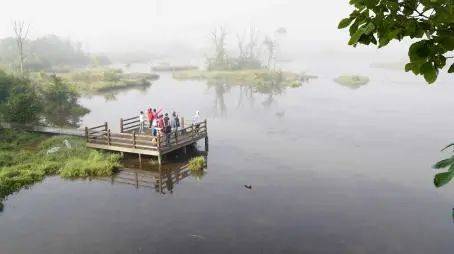 游客们在栈桥上遥望大九湖的美景