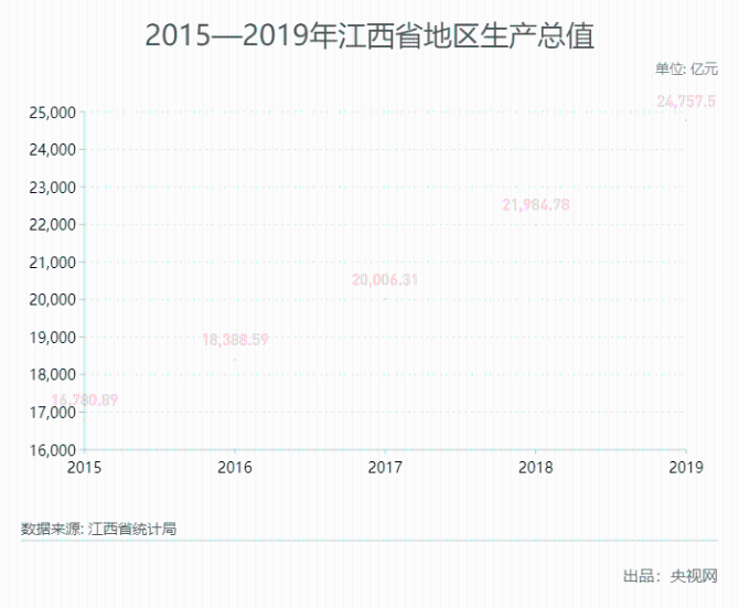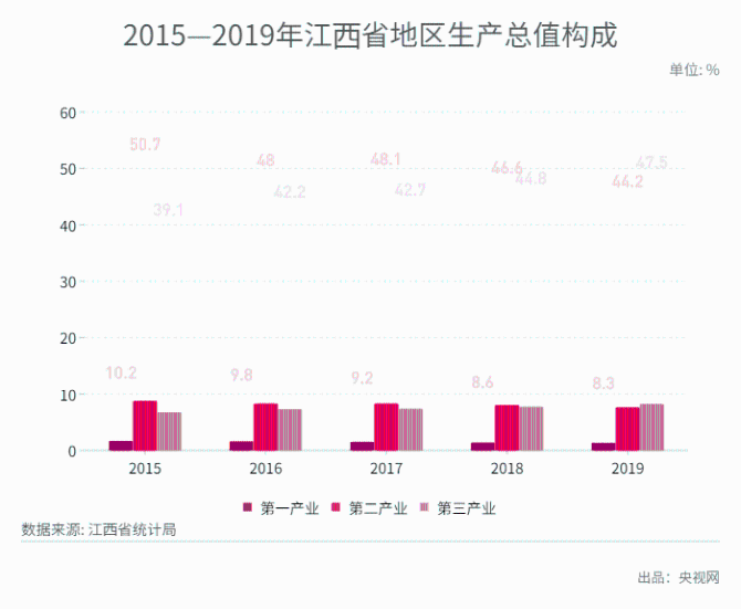 2019年,江西省全年GDP为24757.5亿元,增长8%,增速位列全国第四、中部第一,三次产业分别增长3%、8%、9%。产业结构不断优化,第三产业在经济结构占比持续上升,占比已达47.5%,主要经济指标增幅位居全国前列。2020年以来,面对防控疫情、防汛抗洪、经济发展等的“硬仗”形势下,江西省委、省政府全力做好“六稳”工作,全面落实“六保”任务,上半年全省GDP增长0.9%,主要经济指标基本实现“负转正、位靠前”。