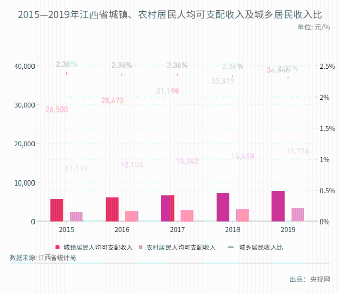 图三:2015—2019年江西省城镇、农村居民人均可支配收入及城乡居民收入比
