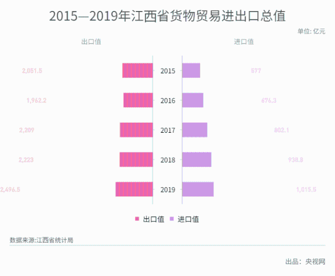 近几年来,江西省认真贯彻执行国家对外开放的各项方针政策、积极推进大开放战略,以国际市场需求为导向,积极参与国际分工、国际竞争,不断开拓海外市场,抓创新,搞技改,对外贸易成绩斐然。2019年,江西省社会消费品零售总额为8421.6亿元,同比增长约9%。进出口总值分别为:出口2496.5亿元,较上年增长约9%;进口1015.5亿元,较上年增长9%。