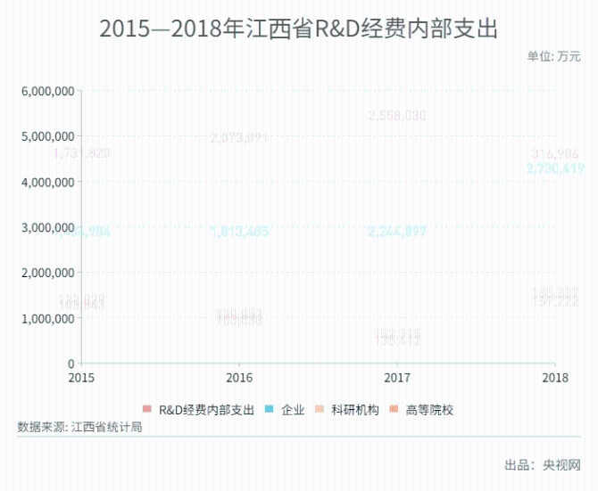 近年来,为推动创新型省份的建设,江西落实了一系列举措来推动相关工作的开展,研究与试验发展经费支出明显增加,2018年共计310亿元,占GDP比值为1.4%,并有望在2019年进一步提高占比到1.6%。未来,江西省将继续顺应新时代创新发展的潮流趋势,集中力量和资源,在创新科技结构优化升级上获得更大的主动权。