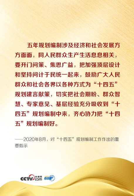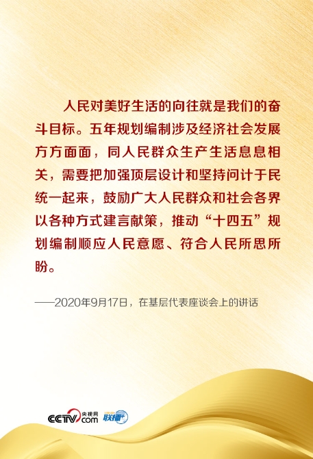 人民对美好生活的向往就是我们的奋斗目标。好的方针政策和发展规划都应该顺应人民意愿、符合人民所思所盼,从群众中来、到群众中去。”近一个月以来,习近平总书记多次主持召开各领域专家座谈会,开门问策,切实把社会期盼、群众智慧、专家意见、基层经验充分吸收到“十四五”规划编制中来。