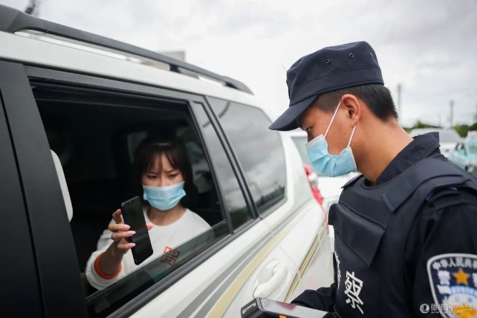 9月22日,瑞丽市民解除居家隔离的第一天。一时间,外出办事的、务工的人员多了起来,整个城区顿时呈现出一片生机来。图为离瑞人员向执勤民警出示云南健康码。杨立 摄