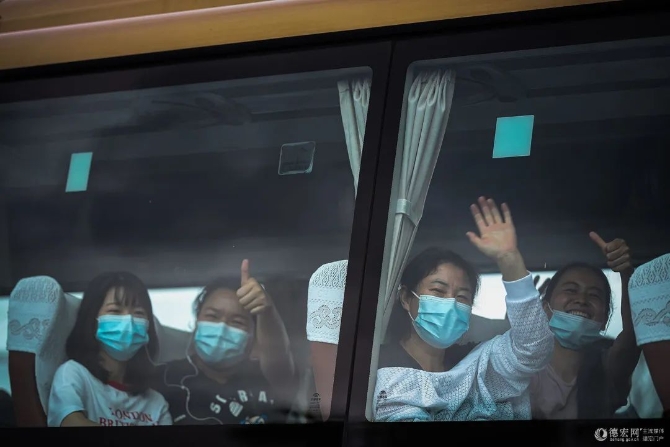 9月22日,大理州援助瑞丽核酸检测志愿队挥手向瑞丽市民告别。杨立 摄