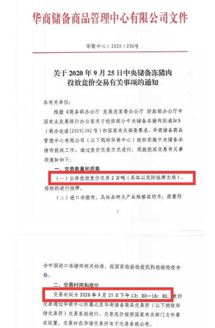 华储网24日发布公告,华商储备商品管理中心有限公司将出库投放竞价交易2万吨中央储备冻猪肉,交易时间为2020年9月25日下午13:00-16:00。