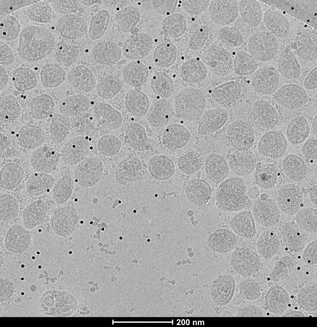 纯化后的灭活新冠病毒冷冻电镜照片。