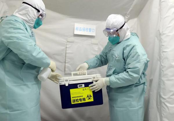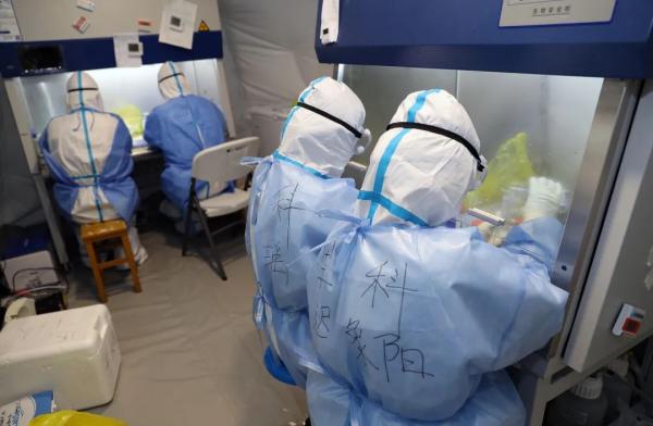 武汉一线,科研人员在帐篷式移动实验室做实验 邵龙飞 摄