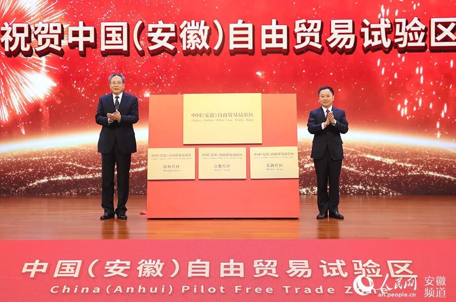安徽省委书记、省人大常委会主任李锦斌,安徽省人民政府省长李国英共同为中国(安徽)自由贸易试验区揭牌。安徽省委宣传部供图
