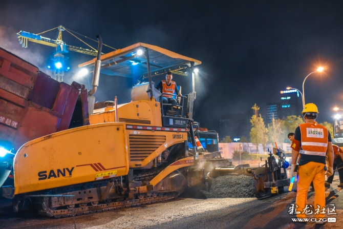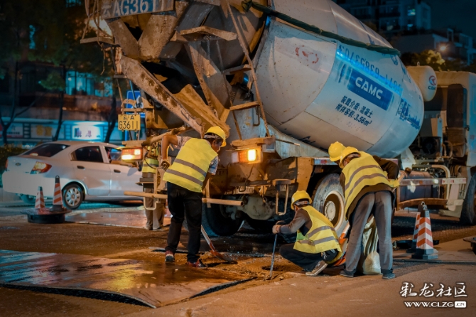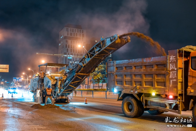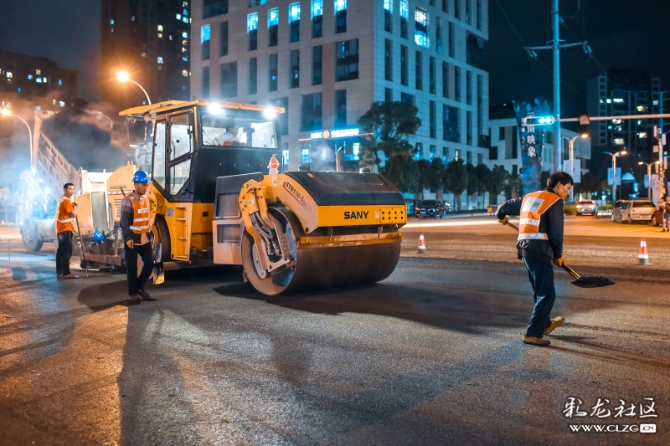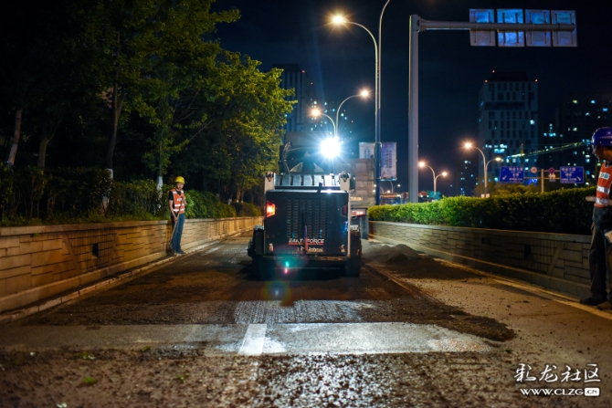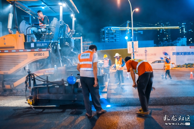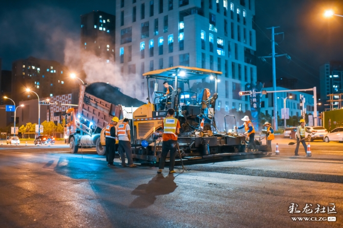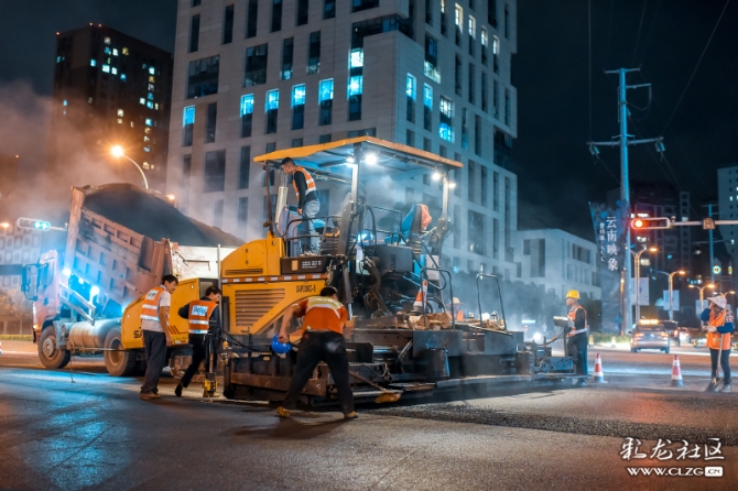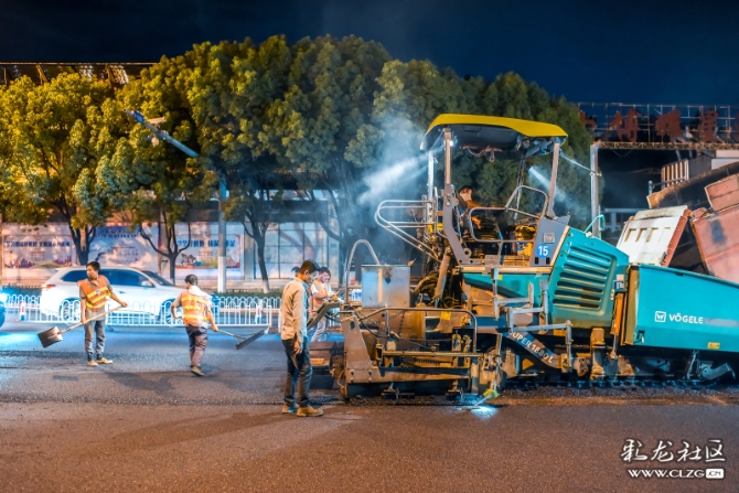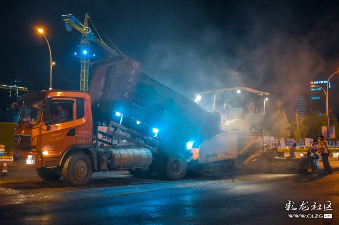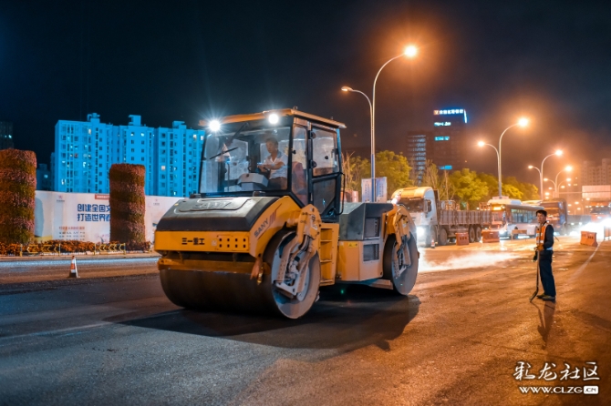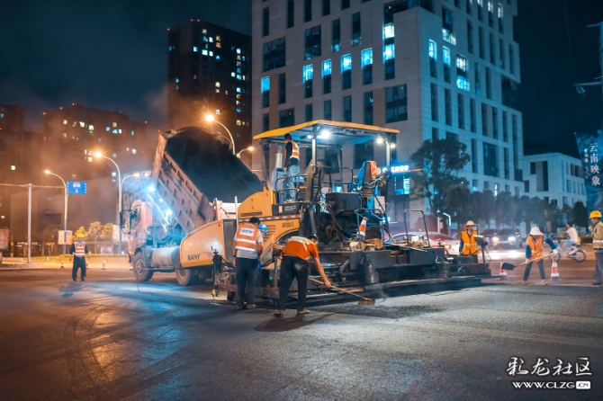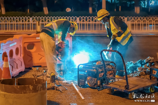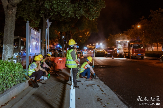 在道路整治提升过程中,施工队伍为方便交通顺畅,只能夜晚施工。深夜,他们正忙碌着…