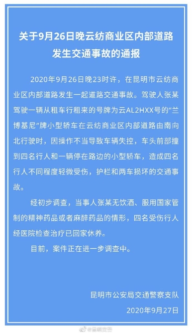 9月27日,记者从昆明交警官方微博获悉,2020年9月26日晚23时许,在昆明市云纺商业区内部道路发生一起道路交通事故。