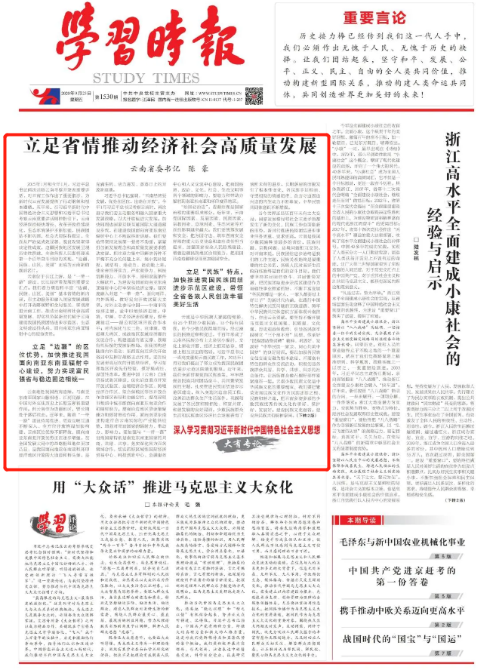 《学习时报》头版头条刊登云南省委书记陈豪署名文章