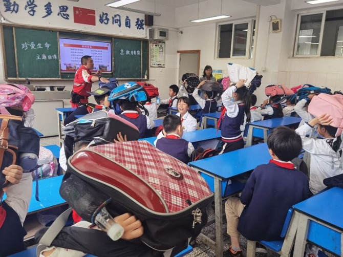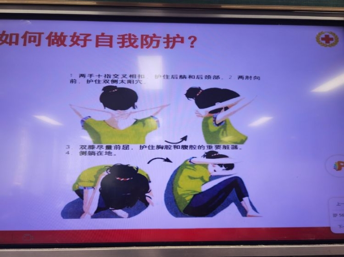 现场演示跌倒后防踩踏受伤知识。