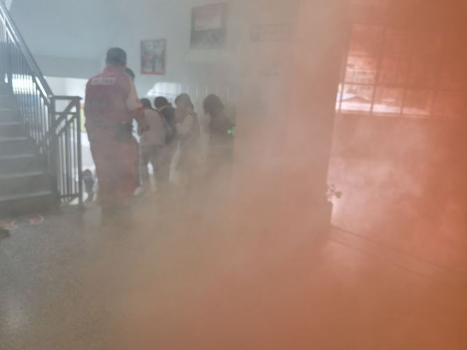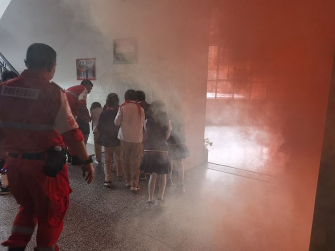 “火光熊熊、烟雾弥漫”,同学们在应急队员的引导下,有序撤离火场。
