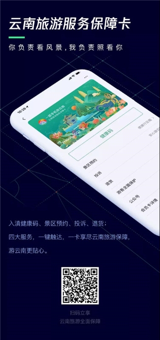 云南旅游服务保障卡集合了云南健康码、景区预约、旅游投诉、购物退货、游客保障等“游云南”App里的政府服务板块的项目,一键装到一张电子卡片里。公众扫描二维码或关注“游云南”公众号,就能一键领取。填写姓名、电话信息,即可激活。游客可以直接在微信卡包里查找和使用。保障卡永久有效,每人限领1张。