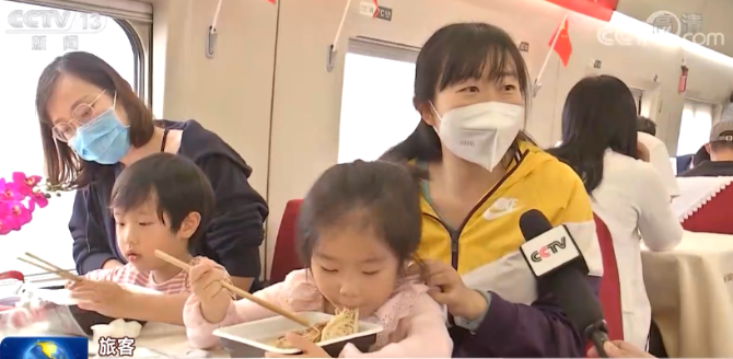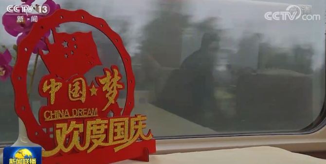 祖国的生日,就是大家的节日。车厢内洋溢着浓郁的国庆氛围。从北京开往武汉的高铁列车上还给乘客准备北京的炸酱面、武汉的热干面,让大家以过生日吃“长寿面”的方式,回味家乡味道,祝福祖国山河无恙、幸福安康。