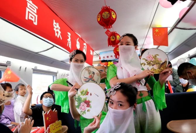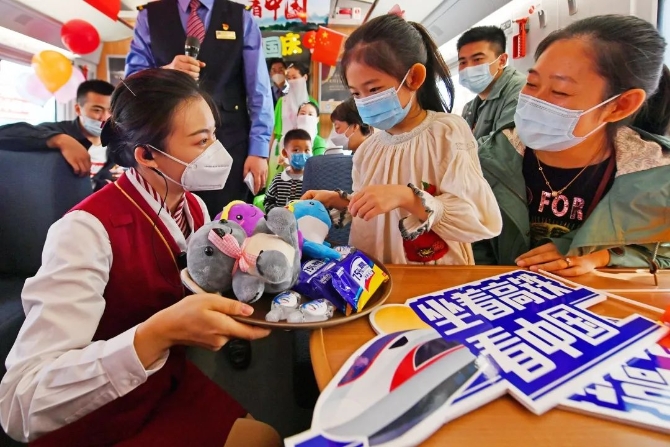 今天,茅文倩坐着高铁、带着喜糖去南京宴请亲朋好友,在路上她和记者讲述了高铁给他们的生活带来的便利。见到在车站迎接自己的爱人王立国后,茅文倩开心地说:“高铁就像一个媒人一样,给我们两个人牵线搭桥。”