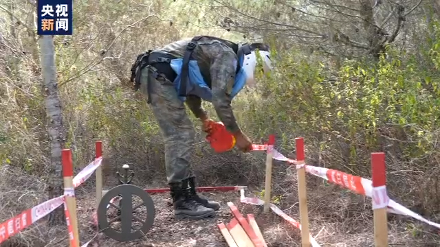 这是中国第19批赴黎巴嫩维和官兵在黎以边境“蓝线”地域的扫雷作业现场。前不久,他们全部一次性通过联合国军事扫雷和人道主义扫雷两种资质认证,正式开启“蓝线”扫雷任务。