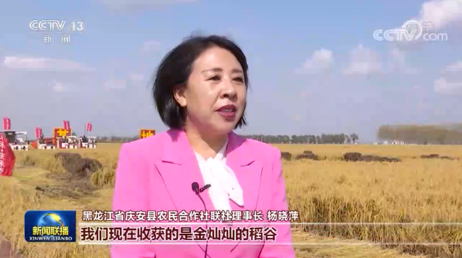 黑龙江省庆安县农民合作社联社理事长 杨晓萍:我们现在收获的是金灿灿的稻谷,为祖国献礼。