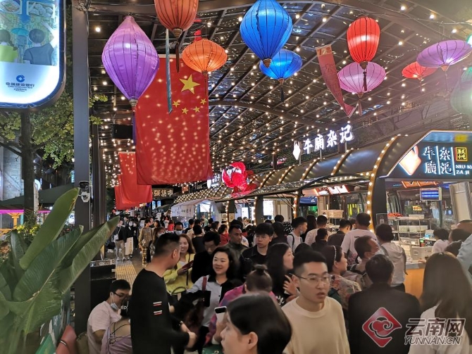 2020年的国庆中秋长假,让人们的出行需求得到了充分的释放。9月30日下午3时,昆明主要的出城高速就已经全线飘红。然而,对于位于昆明主城核心区的南屏步行街来说,本地客源的外流却丝毫没有影响国庆中秋假日经济的火爆氛围。一过中午,南屏街、正义路等主要街道已是人来人往,穿流如织了。