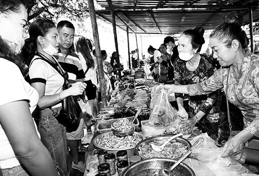 10月3日记者采访中看到,四面八方的傣族群众将自家精心制作的各类美食在赶摆场上摆摊出售,虽然场面非常壮观,却听不到一般集市那种喧嚣,大家交流都是轻言细语,“傣味”十足。