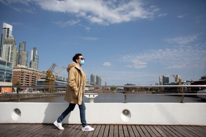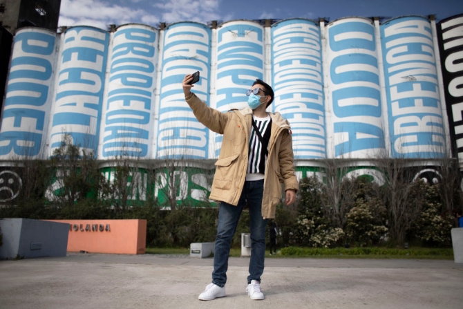 10月3日,在阿根廷首都布宜诺斯艾利斯,功必扬正在街头自拍。(新华社发,马丁·萨巴拉摄)