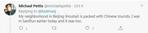 居住在北京的网友Michael Pettis说,自己住在北京后海附近,近日挤满了游客,之前去三里屯发现那里也全是游客。