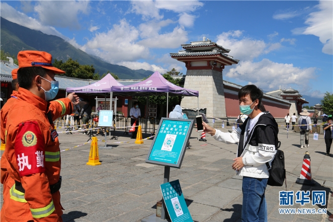 游客扫描健康码进入大理崇圣寺三塔文化旅游区。新华网发(供图)