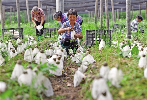 今年以来,江西省宜春市袁州区采取“产业项目+基地+贫困户”的模式,筛选发展潜力足、带动能力强的农业产业项目帮助贫困户脱贫增收。截至目前,该区共安排产业扶贫资金3045万元,惠及产业项目184个,带动20个乡镇256个村1万多户贫困户户均年增收1100元以上。图为袁州区金瑞镇吼里布村食用菌种植基地,村民在采摘竹荪。 周 亮摄(中经视觉)