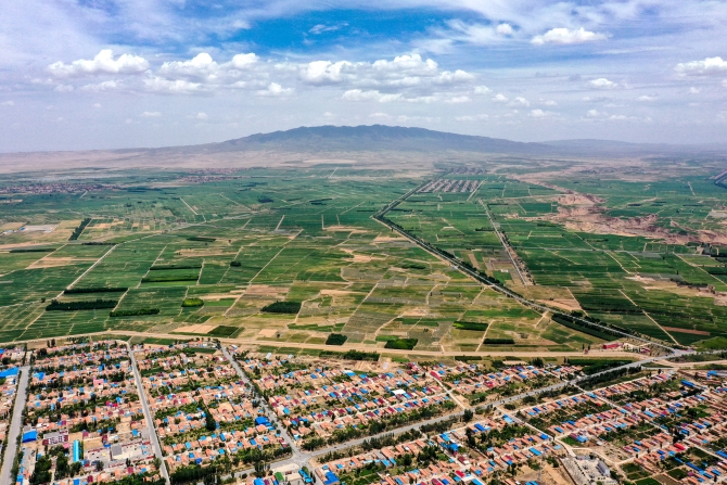这是6月23日拍摄的位于罗山脚下的宁夏吴忠市红寺堡区一角(无人机照片)。